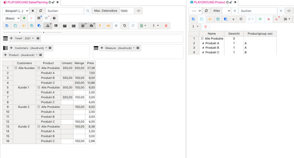 [‚Menge‘] => DB(‚SalesPlanning‘, !TimeY, !Customers, !Product, ‚Umsatz‘);
