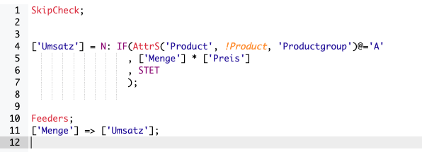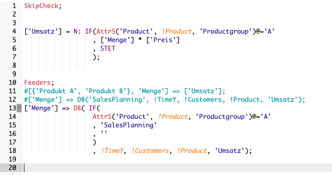 [‚Menge‘] => DB( IF(AttrS(‚Product‘, !Product, ‚Productgroup‘)@=’A‘, ‚Sales_Planning‘, “), !TimeY, !Customers, !Product, ‚Umsatz‘);