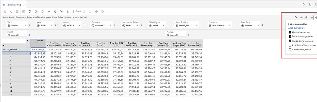 Wie sollte eine gute Default-View aussehen? Sie sollte den häufigsten Anforderungen der User entsprechen. Viele Cubes enthalten beispielsweise eine Measure-Dimension mit „Text“ und „Number“. Da üblicherweise Zahlen angezeigt werden sollen, empfiehlt es sich, standardmäßig „Number“ zu wählen. Ebenso sinnvoll ist es, die aktuelle Planungsversion, das aktuelle Jahr und – falls vorhanden – die relevante Währung auszuwählen.