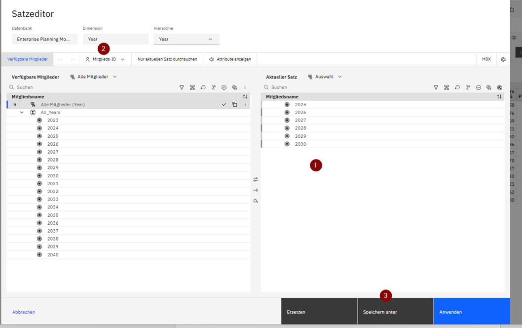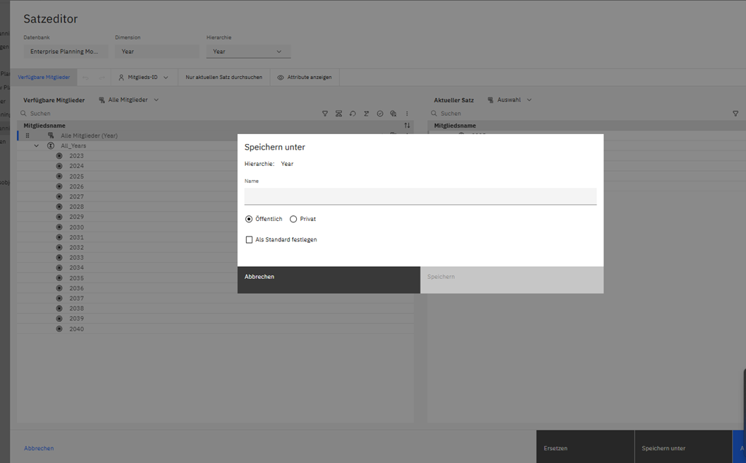 Im Subset-Editor werden links die gesamte Dimension und rechts die Auswahl angezeigt. Nach Wahl eines Alias kann das Subset gespeichert und als öffentlich oder privat markiert werden (öffentliche Subsets erfordern eine Berechtigung).