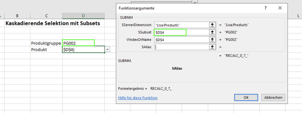 Die SUBNM Formel im Auswahlfeld der Produkte wird dann auf die Zelle der Produktgruppe als Name des anzuzeigenden Subsets verlinkt. So kann eine kaskadierende Selektion stattfinden, bei der durch die Auswahl der Produktgruppe im ersten Schritt die Liste der Produkte eingeschränkt wird.