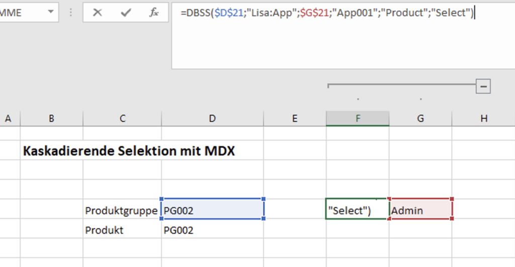 In Variante 2 werden mit Hilfe eines MDX und eines zusätzlichen Cubes dynamische abhängige Auswahllisten erzeugt. Im ersten Auswahlfeld wird mit einer klassischen SUBNM Formel gearbeitet. In unserem Beispiel wieder die Produktgruppe. Die Auswahl dieser Gruppe wird dann per DBSS Formel userabhängig in einen separaten Cube geschrieben. Dieser trägt hier den Namen „App“.