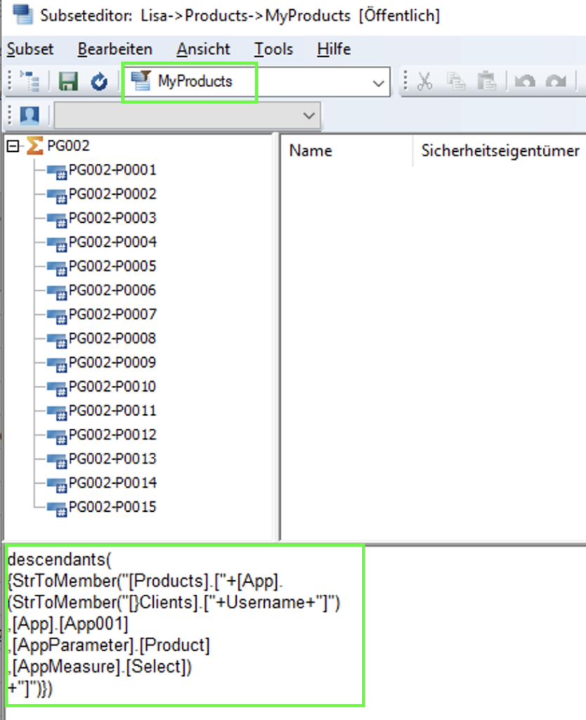 Dieses MDX ist in unserer Product Dimension als dynamisches Subset (MyProducts) gespeichert. Bei der Auswahl der Produkte wird auf dieses Subset zugegriffen.