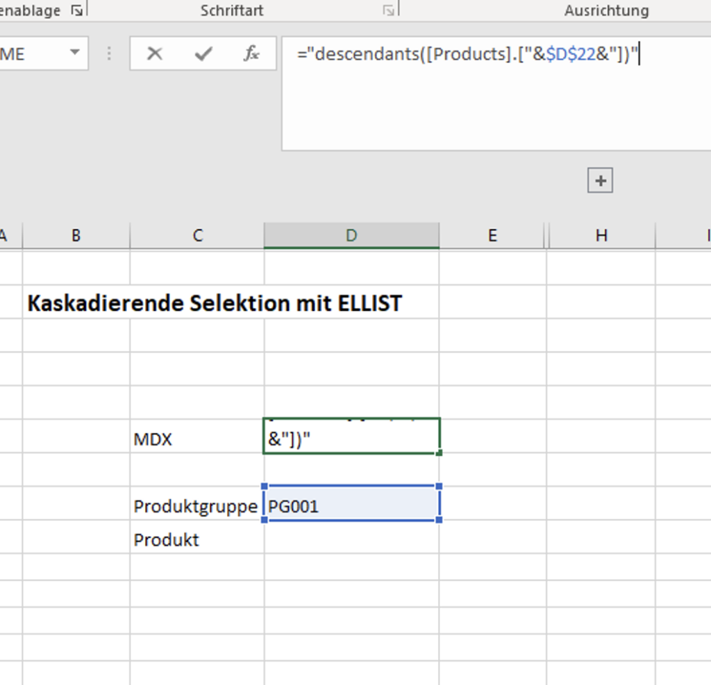 Genau wie bei den vorherigen Varianten bildet das erste DropDown Feld eine klassische SUBNM Formel, hier für die Auswahl der Produktgruppen. Diese Auswahl ist in ein MDX verlinkt, was die Grundlage der TM1ELLIST Formel bildet.