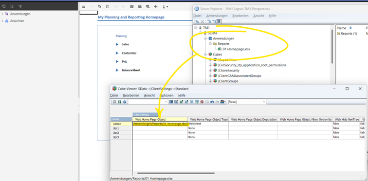 Bisher ist es möglich, die Homepage in TM1 Perspectives oder im Architect einzurichten. Dies erfolgt durch einen Rechtsklick auf den TM1 Server, gefolgt von der Auswahl von „Sicherheit“ und „Benutzer/Gruppen“. Hier kann der gewünschte Bericht als Homepage ausgewählt werden. Dies führt dazu, dass der Pfad zum Ordner „Externals“ im Dateiverzeichnis angezeigt wird, was zur Ablage des Links im Cube }ClientSettings führt, um die Homepage aufzurufen