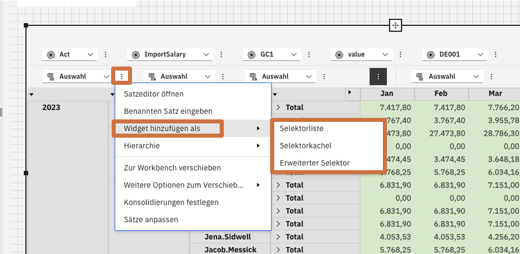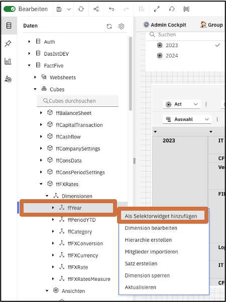 Du kannst ein Selektorwidget direkt über die linke Datenleiste als Dimension eines Cubes einfügen oder aus einer bereits bestehenden View auf deiner Registerkarte eine Dimension herausziehen.