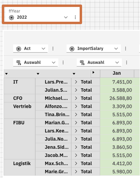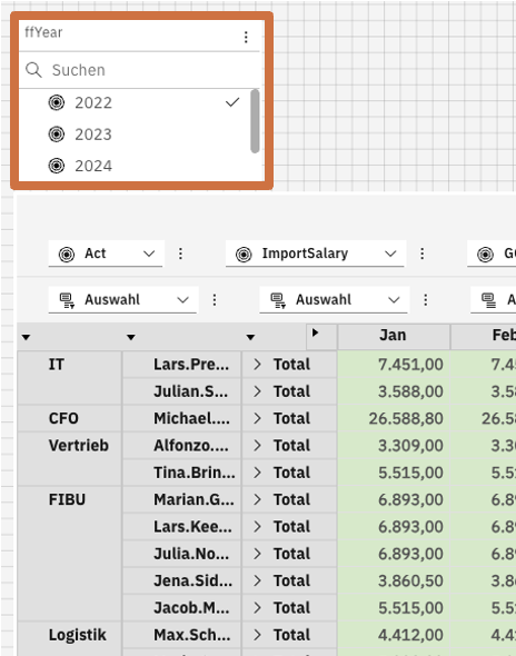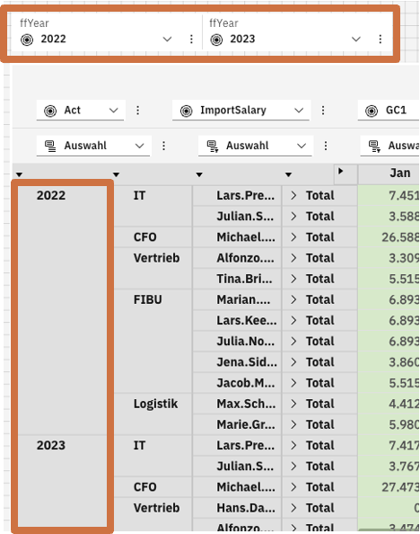Mit dem erweiterten Selektor kann nicht nur ein Element, sondern ein ganzes Intervall ausgewählt werden. Das ist z.B. besonders praktisch, wenn man eine Abbildung jahresübergreifend darstellen möchte und dann z.B. Jahr 2022 bis 2023 abbildet. Wichtig ist dafür, dass die entsprechende Dimension, in unserem Bsp. „ffYear“, Teil der Spalten- oder Zeilendimensionen einer View ist und nicht als Titeldimension hinterlegt wurde.