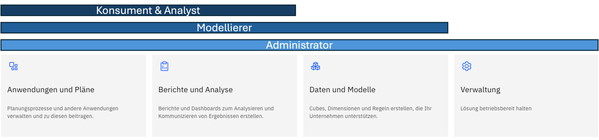 Es muss zwischen vier verschiedenen Rollen unterschieden werden: Analyst, Administrator, Konsument und Modellierer. Müsste man kurz und knapp erklären, worin der Unterschied liegt, dann wäre das wohl welche der Kacheln auf der PAW Startseite die spezifische Rolle sehen und damit nutzen kann. Während der Administrator alle vier Kacheln sehen kann, also inkl. „Verwaltung“, kann der Modellierer drei Kacheln und der Konsument und Analyst nur zwei Kacheln sehen. Das Schaubild bildet genau diese Unterscheidung ab.