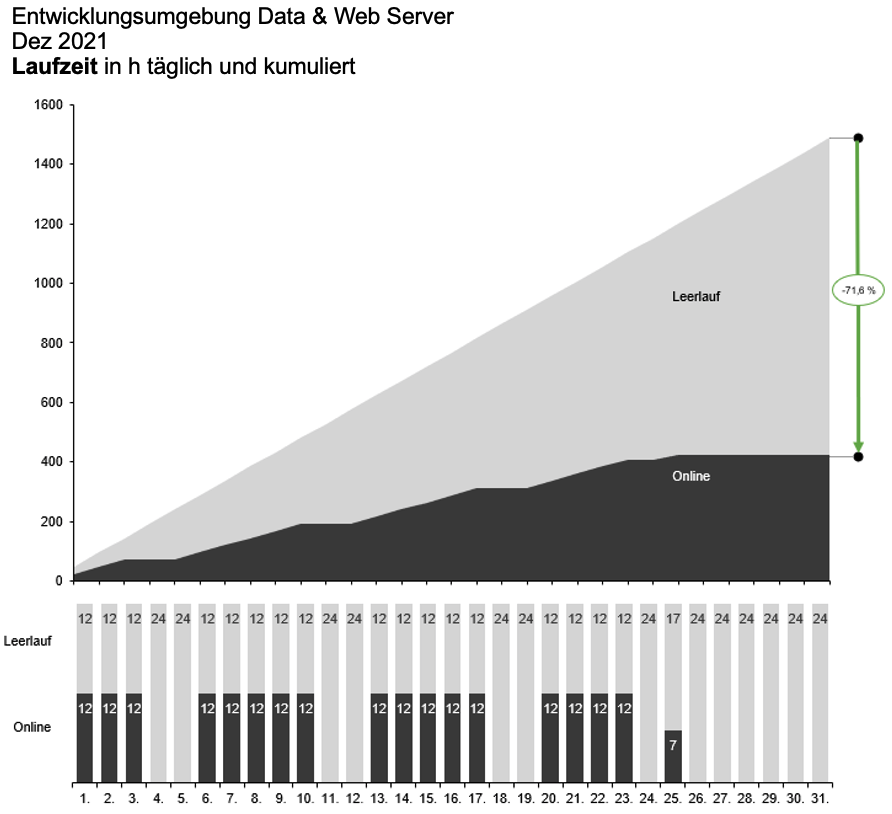 Im Vergleich zu 7 Tagen / Woche im Dauerbetrieb ergibt sich ein Kostensenkungspotential von 67 Prozent. Verzichtet man auf die DEV-Umgebung auch an Feiertagen, kann man in Bayern im Jahr 2021 weitere 104 Stunden einsparen.